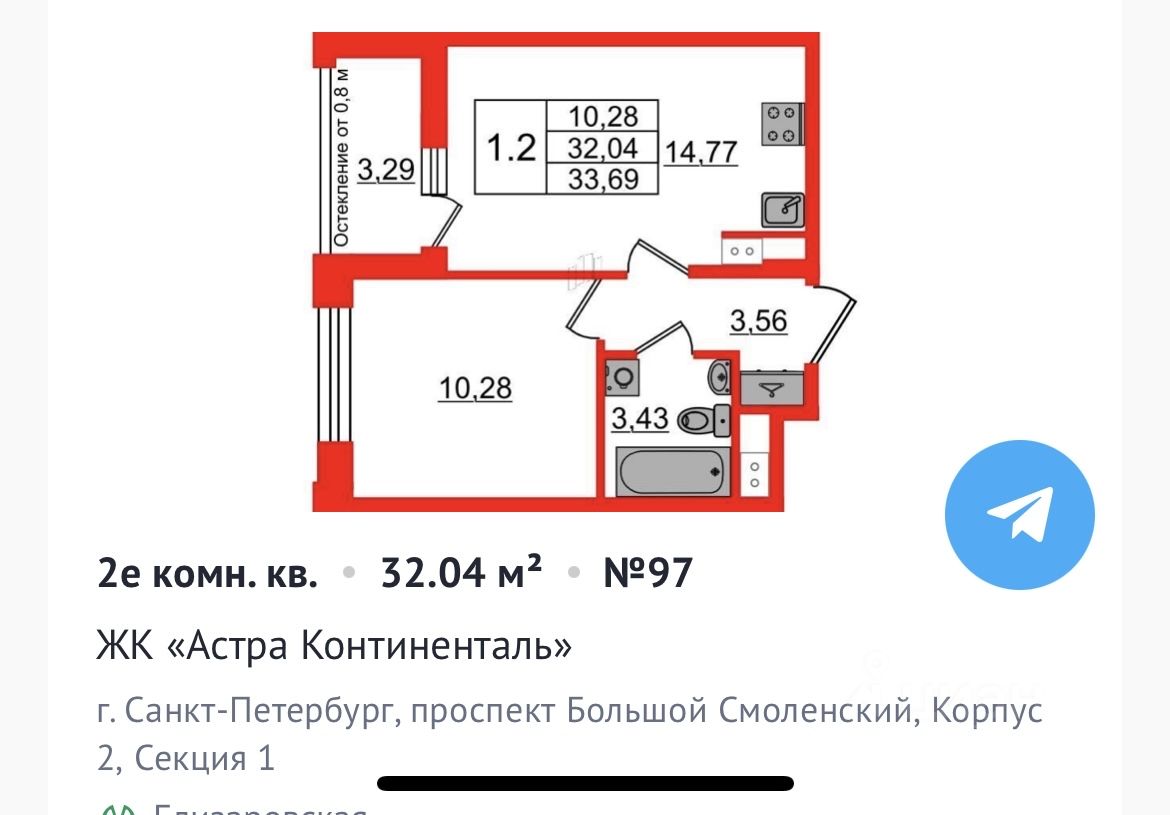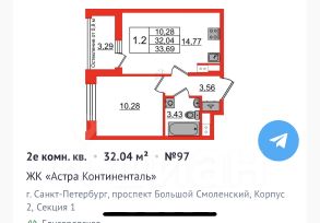 Отделка ЧИСТОВАЯ, 2 корпус, дальний от моста, 8 этаж, с лучшим видом. До метро можно добраться пешком всего за 5 минут.Удобная, классическая, функциональная европланировка, большая кухня-гостиная 14.77м², вместительная прихожая 3.56м². Общая площадь квартиры - 32.04м², жилая 10.28м², высота потолка 2.77 м. Большая лоджия с остеклением в пол. Сдача 3 кв 2026г. Квартира продается с отделкой NORD LINE SILVER ВК NEW.Что особенного в ЖК Астра Континенталь?• Уникальная локация 400 метров до метро, 300 метров до благоустроенной набережной• Самодостаточный квартал со всей инфраструктурой в 3-х км от Невского проспекта• Впечатляющий объем благоустройства: 30 000 кв. метров рекреационных зон с променадом и гейзерными фонтанами• Масштабный парк Город Спорта