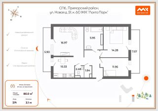 Арт. 128329108 Представляю Вашему вниманию уютную двух комнатную квартиру 80 кв.м в закрытом клубном поселке Лахта парк!