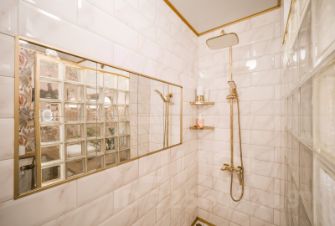 — ванная комната выполнена в светлых тонах с кафелем под мрамор, просторным душем walk in
