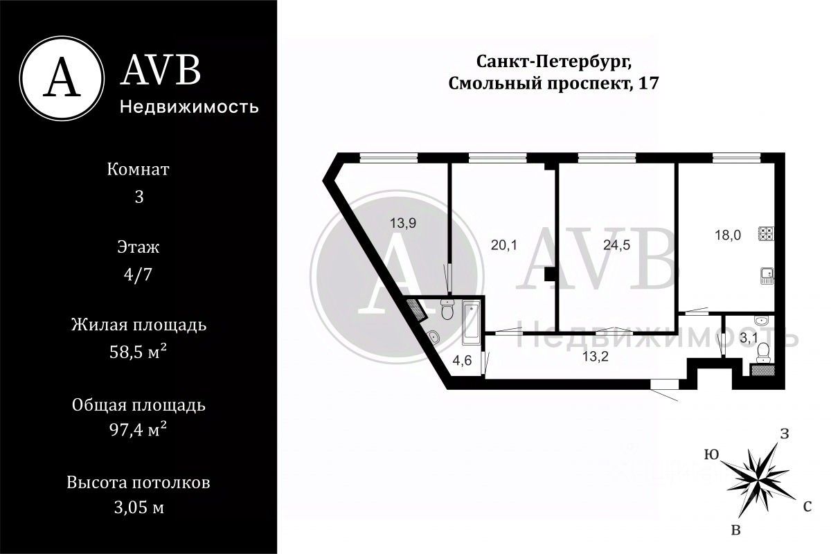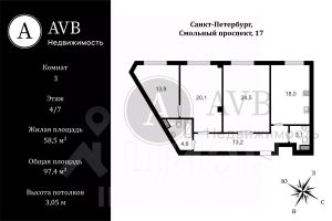Продаётся просторная 3-комнатная квартира в элитном жилом комплексе на Смольном проспекте, 17. 4 этаж из 7, потолки 3,05 м, квартира полностью готова к проживанию: дизайнерский ремонт, мебель и техника — заезжай и живи.