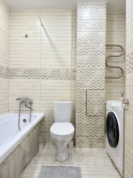 В совмещенном санузле эргономично установлены ванна и стиральная машина.