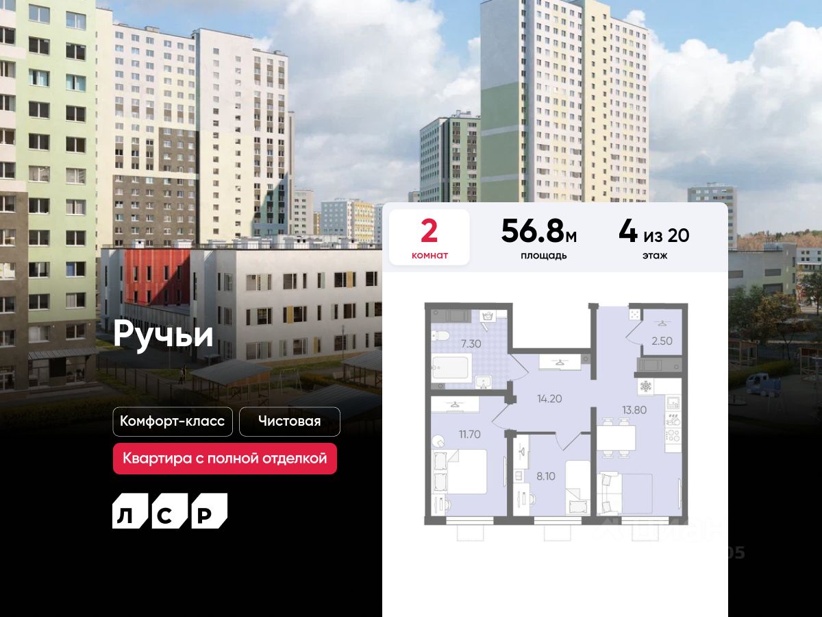 Продаётся 2-комнатная квартира в ЖК "Ручьи" на 4 этаже. Общая площадь составляет 56.80 кв. м. Квартира с чистовой отделкой. Жилой комплекс "Ручьи" располагается по адресу Санкт-Петербург, Красногвардейский.