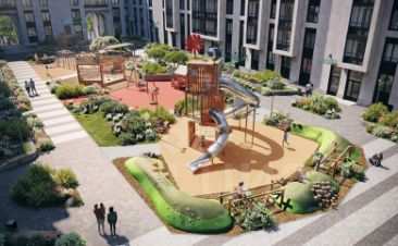 На территории комплекса имеются спортивные и детские площадки, разделенные по возрастам, а также места для отдыха. Зонирование создано с помощью озеленения, дорожек, подпорных стен и геопластики. В проекте предусмотрен подземный паркинг и кладовые на -1 этаже, а также система контроля доступа и видеонаблюдение.