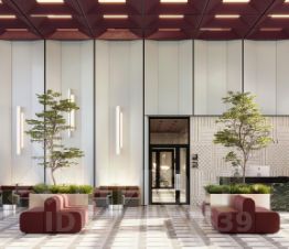 Двусветный холл связывает пространства внутреннего двора и улицы, является порталом в обособленный тихий двор жилого комплекса. Высокие витражи обеспечивают просматриваемость пространства, приглашая пройти внутрь.