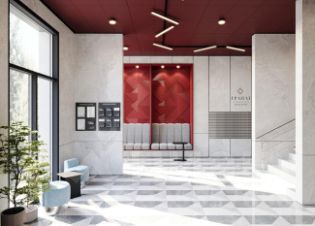 Двусветный холл связывает пространства внутреннего двора и улицы, является порталом в обособленный тихий двор жилого комплекса. Высокие витражи обеспечивают просматриваемость пространства, приглашая пройти внутрь.