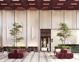 Двусветный холл связывает пространства внутреннего двора и улицы, является порталом в обособленный тихий двор жилого комплекса. Высокие витражи обеспечивают просматриваемость пространства, приглашая пройти внутрь.