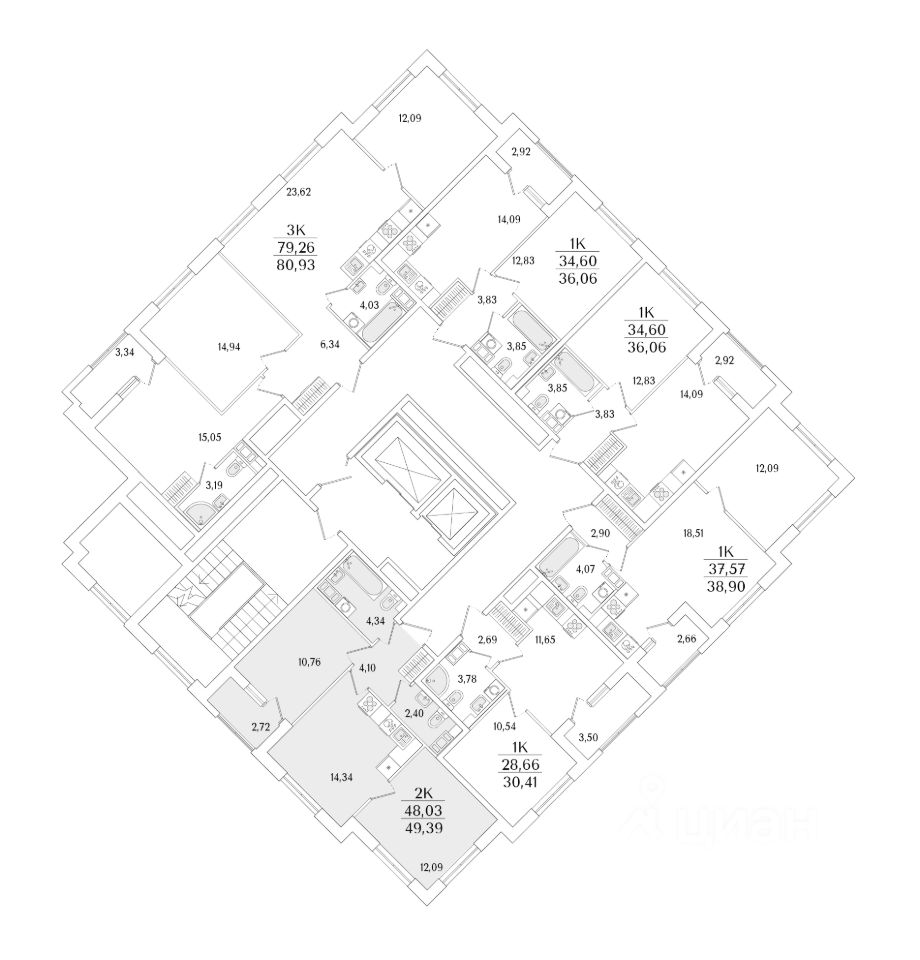 Квартира находится в 13 этажном доме, в Гранат - Корпус К2 на 13 этаже. Общая площадь квартиры 49,39 кв.м.