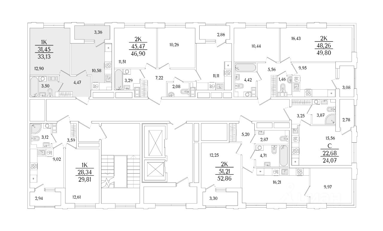 Квартира находится в 13 этажном доме, в Гранат - Корпус К1 на 2 этаже. Общая площадь квартиры 33,13 кв.м.