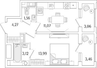 Квартира находится в 13 этажном доме, в Гранат - Корпус К1 на 3 этаже. Общая площадь квартиры 37,27 кв.м.