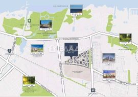 Закрытый двор, пешеходные аллеи, велодорожки, спортивные площадки, скейтпарк, тренажеры, фонтан.