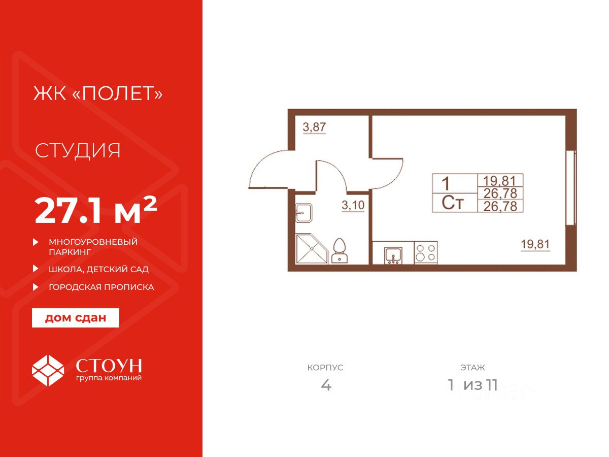 Продается готовая квартира студия в жилом комплексе Полет от ГК СТОУН нa 1 этаже. Общaя площадь cоcтaвляeт 27.10 кв. м.
