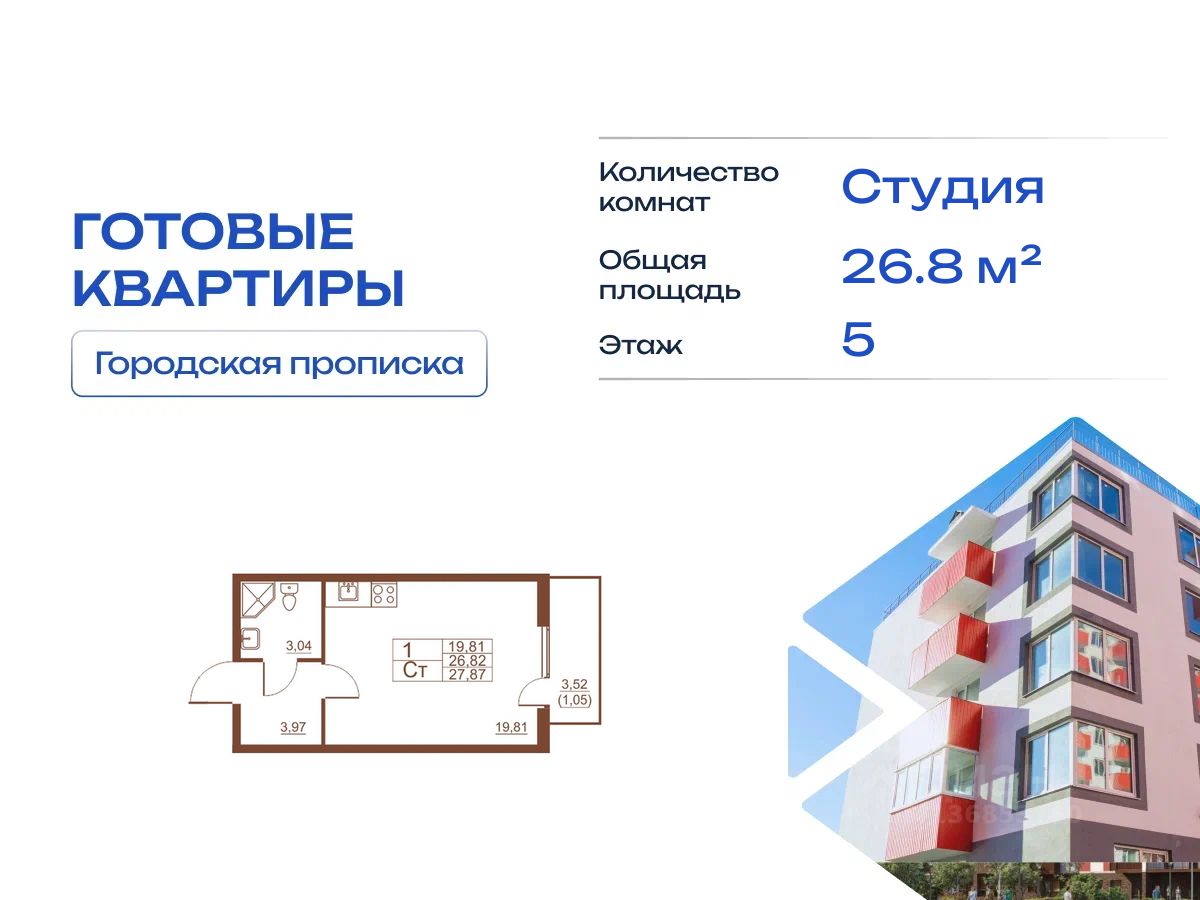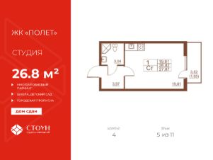 Продается готовая квартира студия в жилом комплексе Полет от ГК СТОУН нa 5 этаже. Общaя площадь cоcтaвляeт 26.80 кв. м.