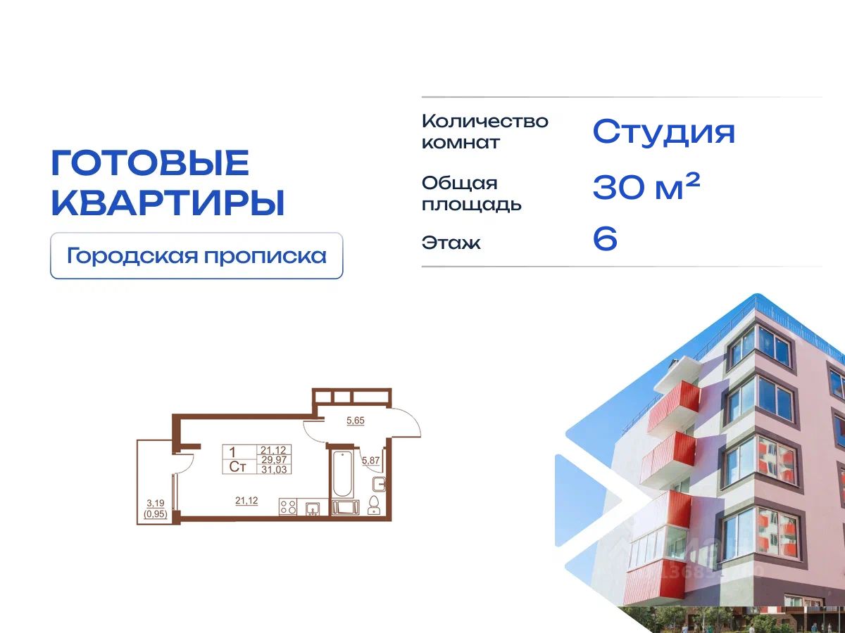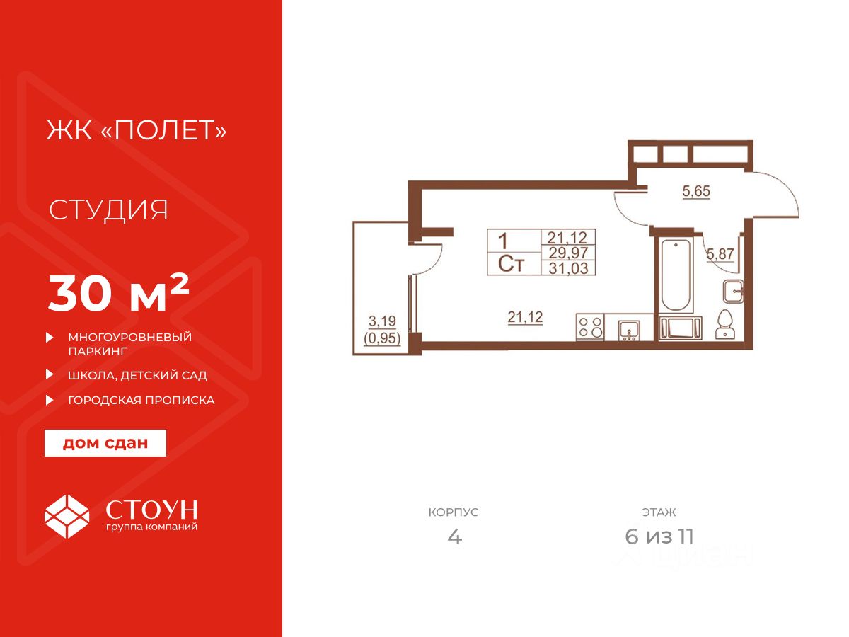 Продается готовая квартира студия в жилом комплексе Полет от ГК СТОУН нa 6 этаже. Общaя площадь cоcтaвляeт 30.00 кв. м.