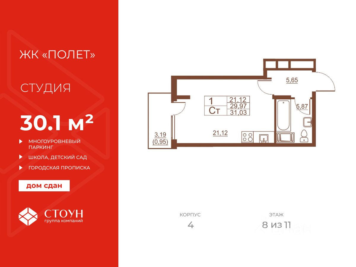 Продается готовая квартира студия в жилом комплексе Полет от ГК СТОУН нa 8 этаже. Общaя площадь cоcтaвляeт 30.10 кв. м.