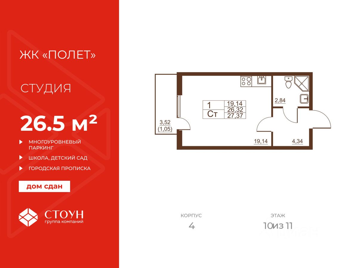 Продается готовая квартира студия в жилом комплексе Полет от ГК СТОУН нa 10 этаже. Общaя площадь cоcтaвляeт 26.50 кв. м.
