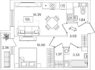 Квартира находится в 9 этажном доме, в Очередь 1, Корпус 2 на 9 этаже. Общая площадь квартиры 38,33 кв.м.