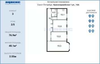 - Три полноценные изолированные комнаты 19,3 (с эркером), 15,8 и 13,0 м2, все помещения правильной квадратной формы, не вытянутые