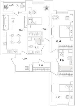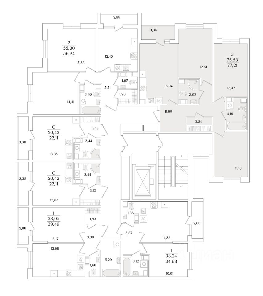 Квартира находится в 9 этажном доме, в Очередь 2, Корпус 2 на 5 этаже. Общая площадь квартиры 77,21 кв.м.