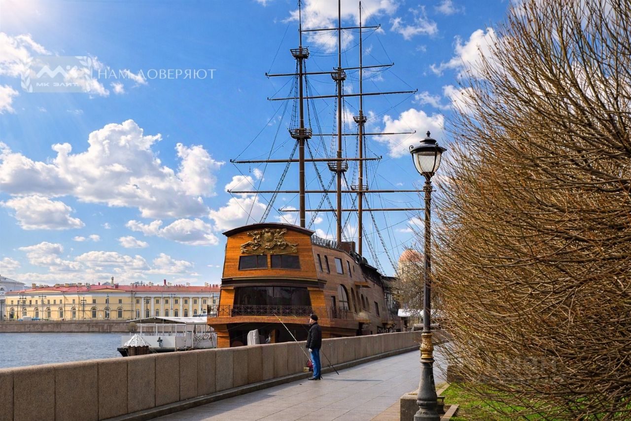 Квартира находится в доме у набережной Невы, ориентир - корабль "Летучий Голландец", с ресторанами на борту. С этого места во всей красе видны главные доминанты Петербурга - Стрелка Васильевского острова, Зимний дворец, Петропавловская крепость, топовые рестораны - всё это здесь, в шаговой доступности.