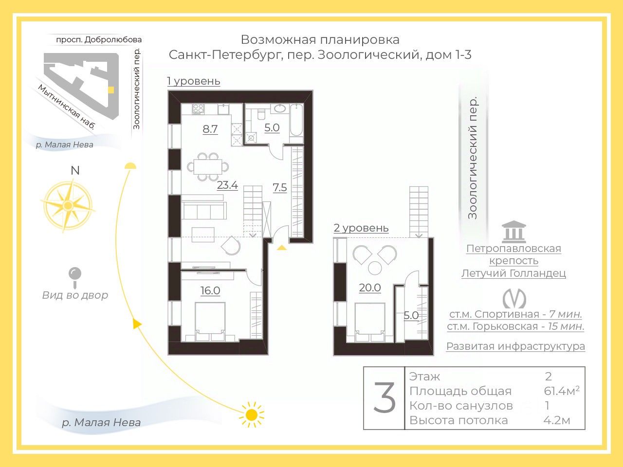 -Площадь 61.7м2 и потолки 4.20м! Это идеальный объём, с возможностью легко интегрировать приточно-вытяжную систему с кондиционированием на этапе ремонта.