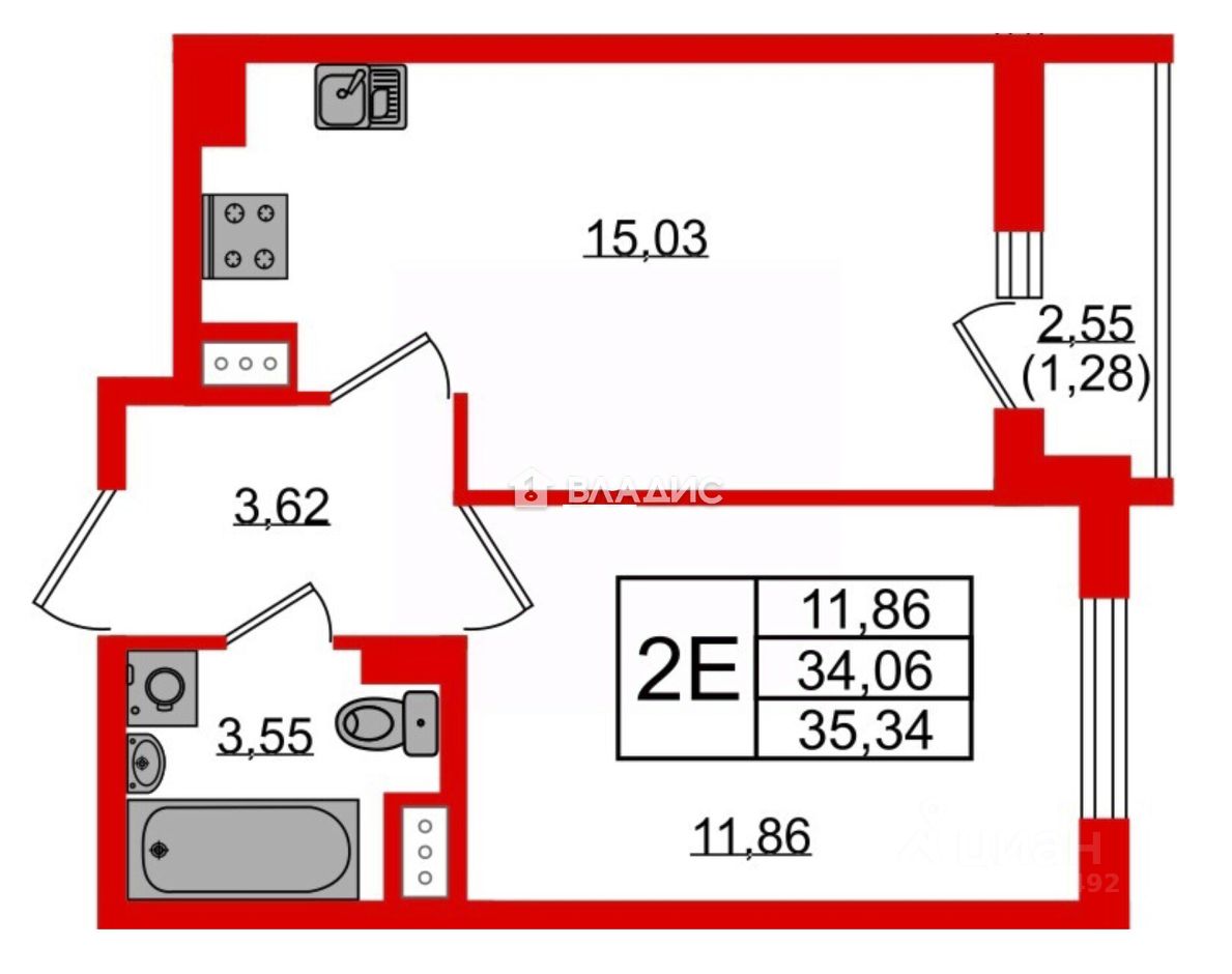 - Общая площадь: 35,34 кв. м.