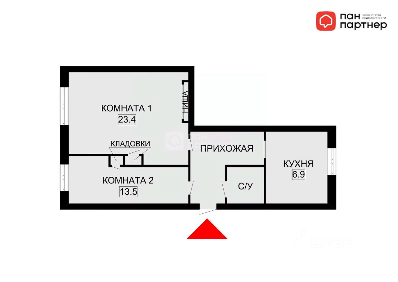 Общая площадь квартиры - 52 кв.м., две раздельные комнаты - 23,4 + 13,5 кв.м., кухня - 7 кв.,м., высота потолков - 2,8 м., совмещенный с/у. В квартире установлена газовая колонка.
