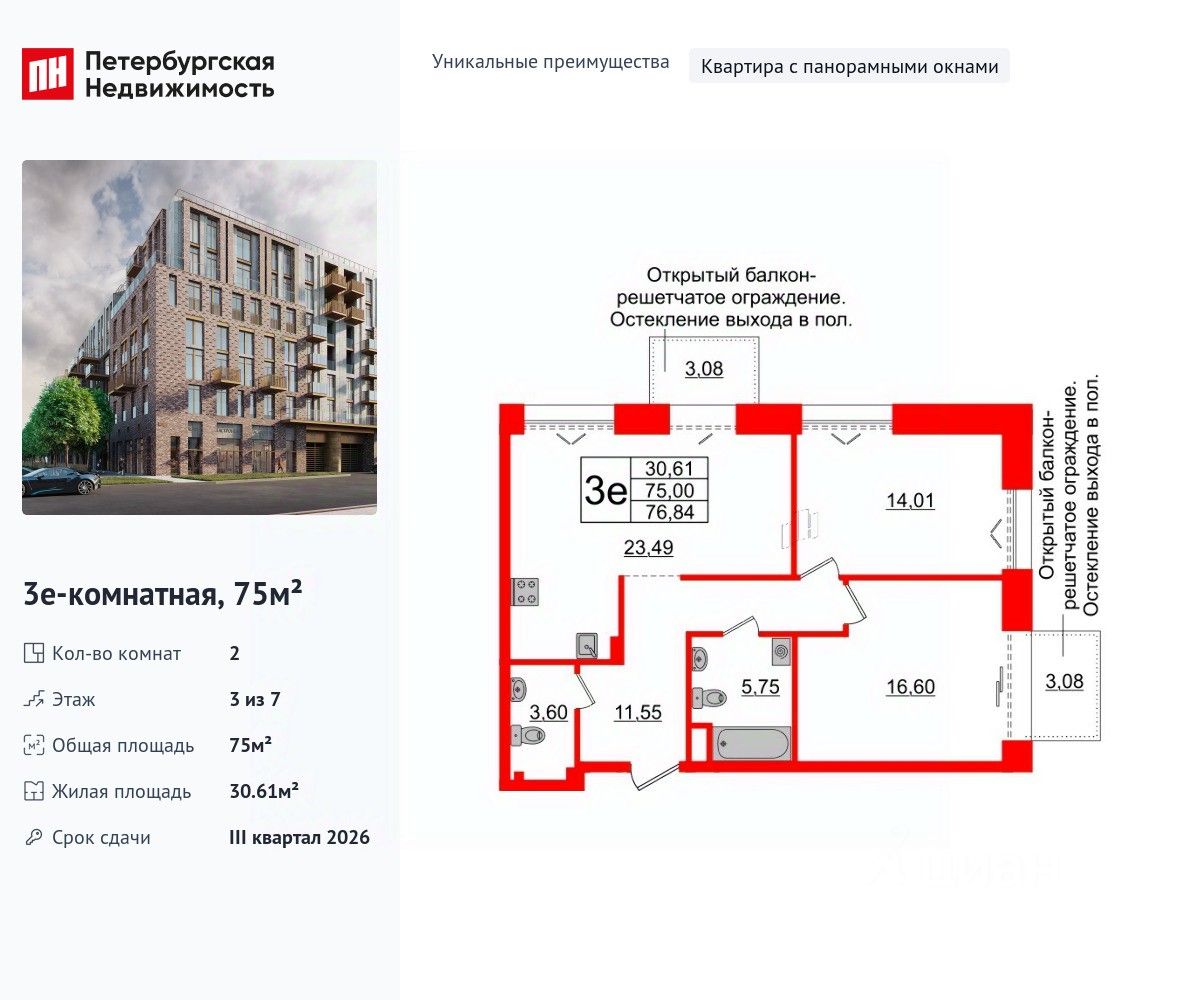 Уникальная, функциональная европланировка, большая кухня-гостиная 23.49 м², просторная прихожая 11.55 м². Общая площадь квартиры - 75 м², жилая 30.61 м², высота потолка 3 м.