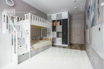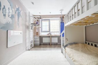 Функциональная двухъярусная кровать, большой шкаф для вещей, письменный стол со встроенными шкафчиками и полками с подсветкой. Большое окном с видом на улицу .