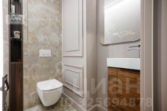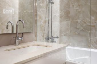 Раздельный санузел с теплым полом, компактная мойка, высокое зеркало, встроенные шкафчики, система очистки воды со скрытым люком.
