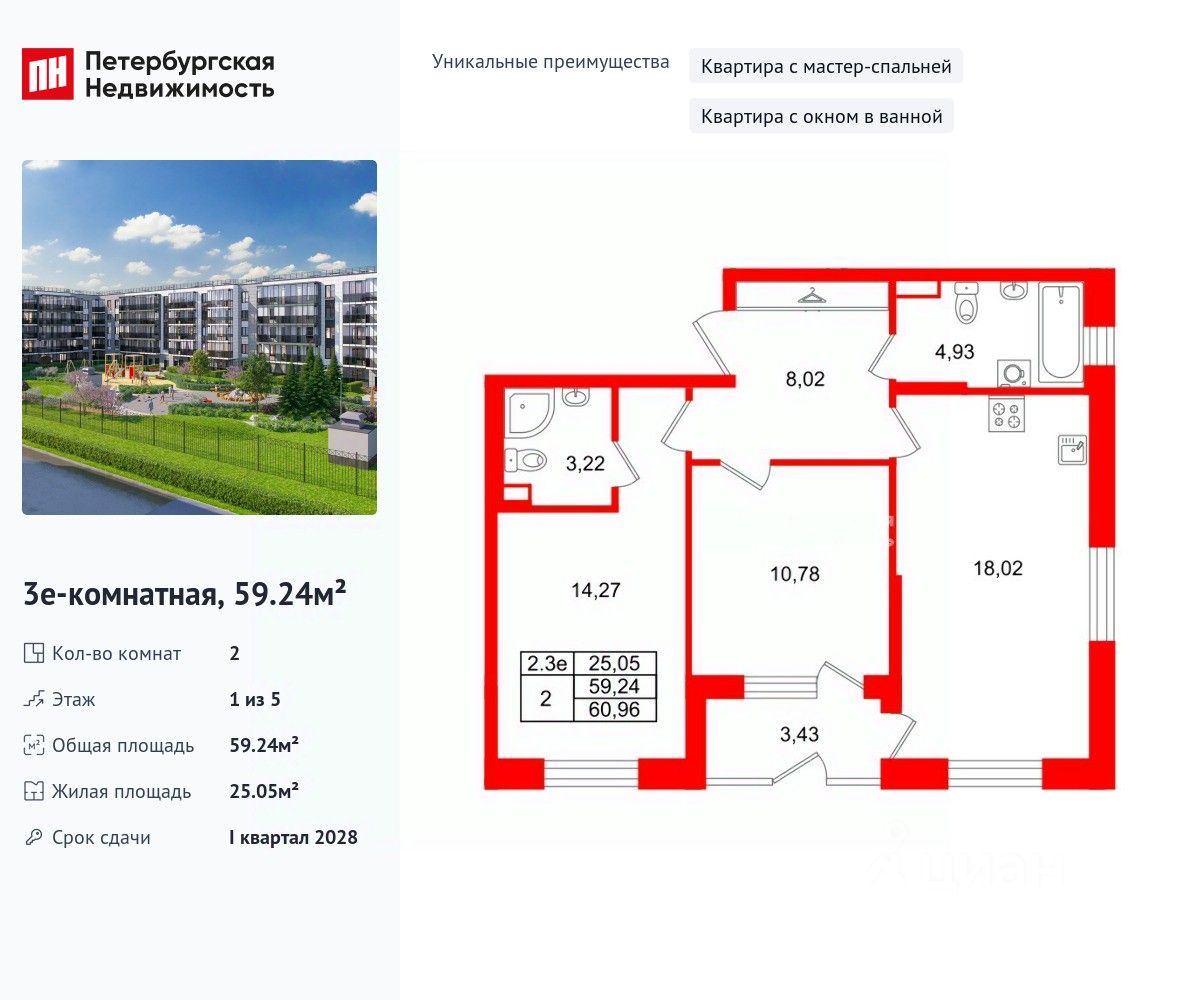 Уникальная, функциональная европланировка, большая кухня-гостиная 18.02 м², просторная прихожая 8.02 м². Общая площадь квартиры - 59.24 м², жилая 25.05 м², высота потолка 2.77 м.