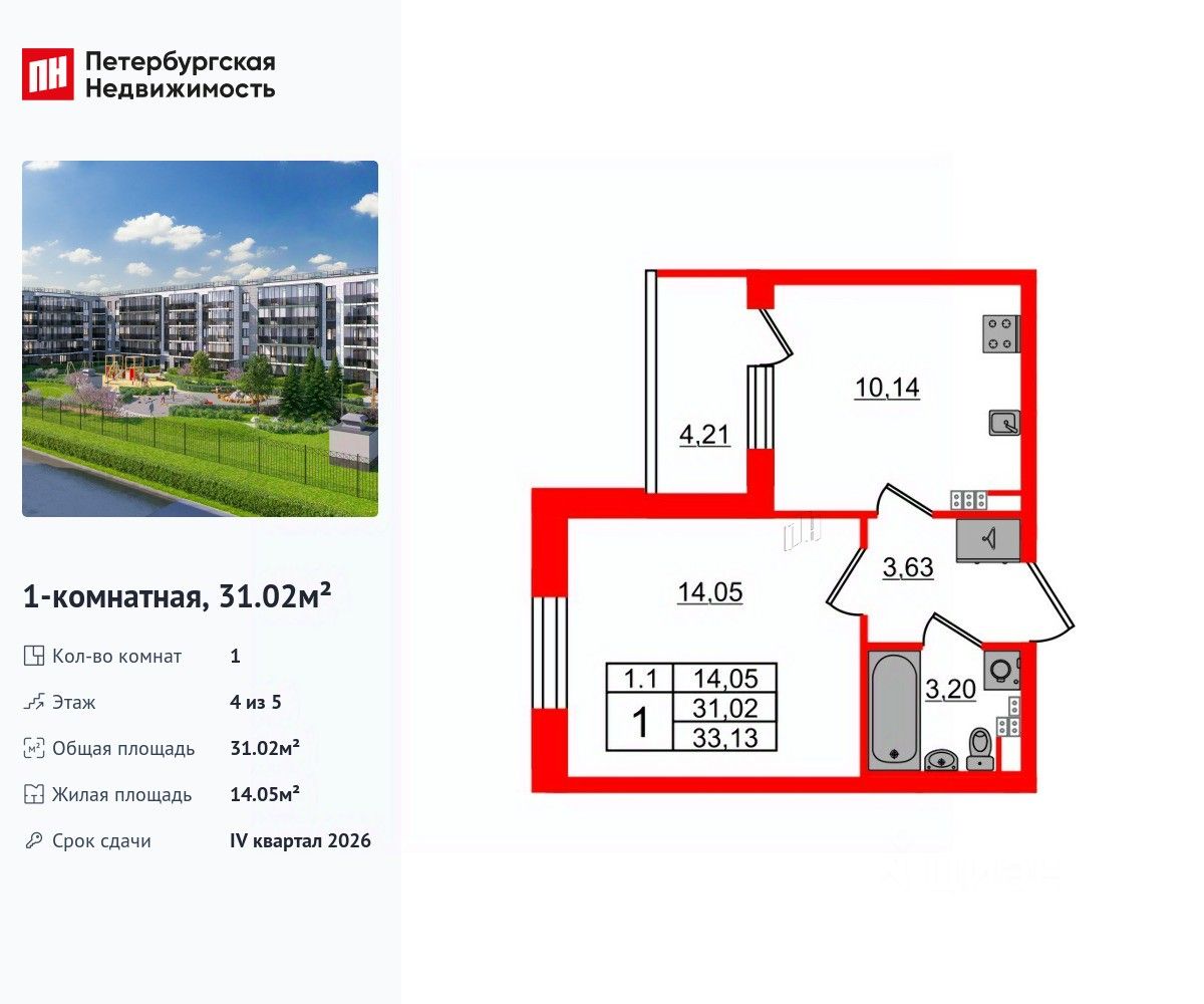 Удобная, классическая планировка, кухня 10.14 м², вместительная прихожая 3.63 м². Общая площадь квартиры - 31.02 м², жилая 14.05 м², высота потолка 2.77 м.