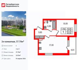 Удобная, классическая, функциональная европланировка, большая кухня-гостиная 17.52 м², просторная прихожая 5.65 м². Общая площадь квартиры - 37.78 м², жилая 10.55 м², высота потолка 2.77 м.