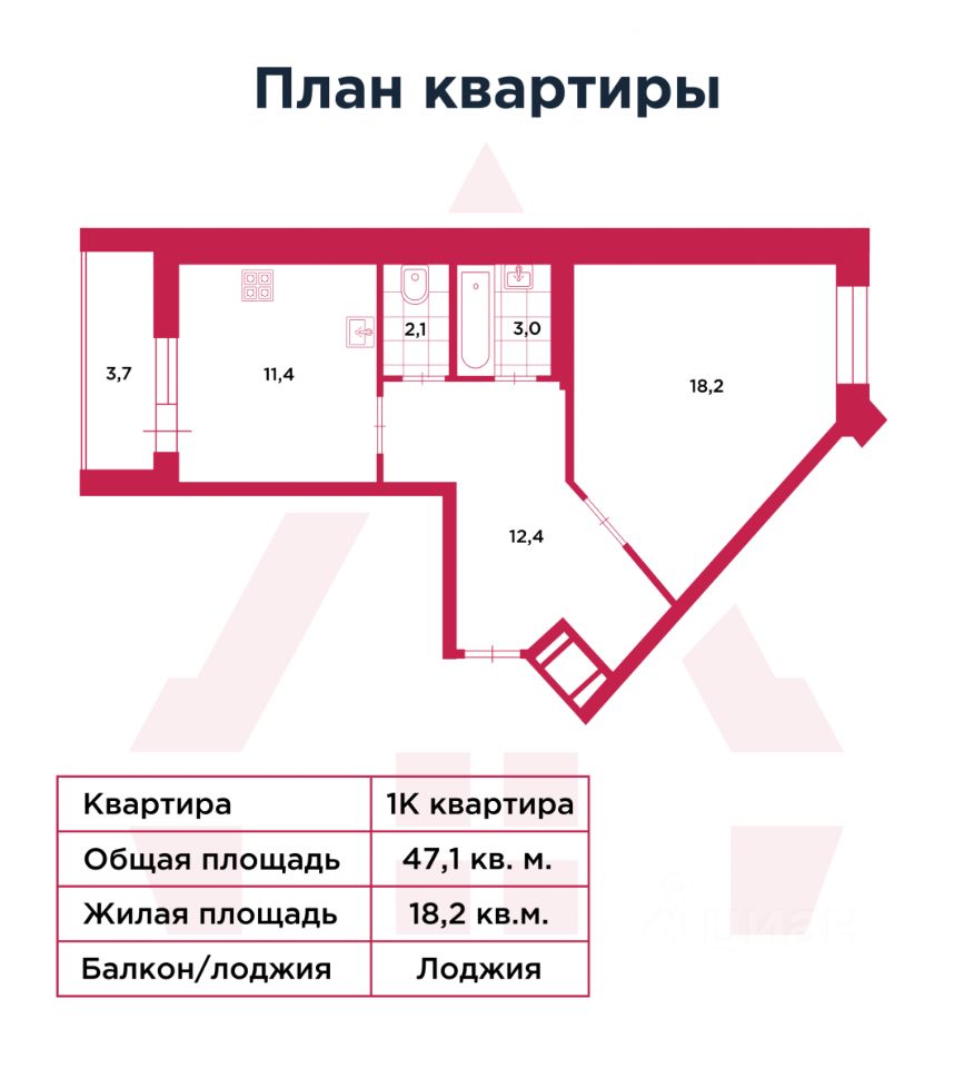 • Общая площадь: 47,1 кв.м — приятный размер для 1-комнатной квартиры.