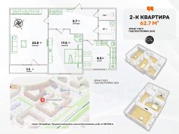 Общая площадь: 62.7 м² | Жилая: 40.8 м² (17.0 + 23.8 м²)