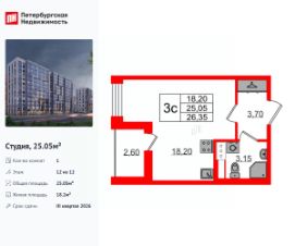 Удобная, классическая, функциональная европланировка, просторная прихожая 3.7 м². Общая площадь студии - 25.05 м², жилая 18.2 м², высота потолка 3 м.