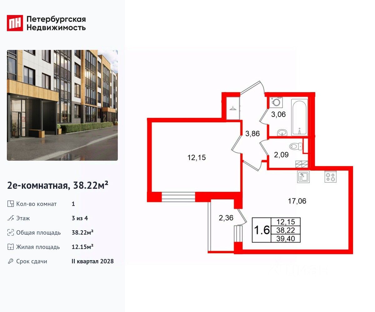 Удобная, классическая, функциональная европланировка, большая кухня-гостиная 17.06 м², вместительная прихожая 3.86 м². Общая площадь квартиры - 38.22 м², жилая 12.15 м², высота потолка 2.77 м.