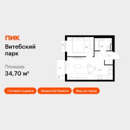 Продаётся 1-комн. квартира площадью 34,7 кв.м на 12 этаже 12 этажного дома (Корпус 6, Секция 4) проекта ПИК Витебский парк. Светлый просторный подъезд на уровне земли, функциональная планировка, большие окна, c отделкой.