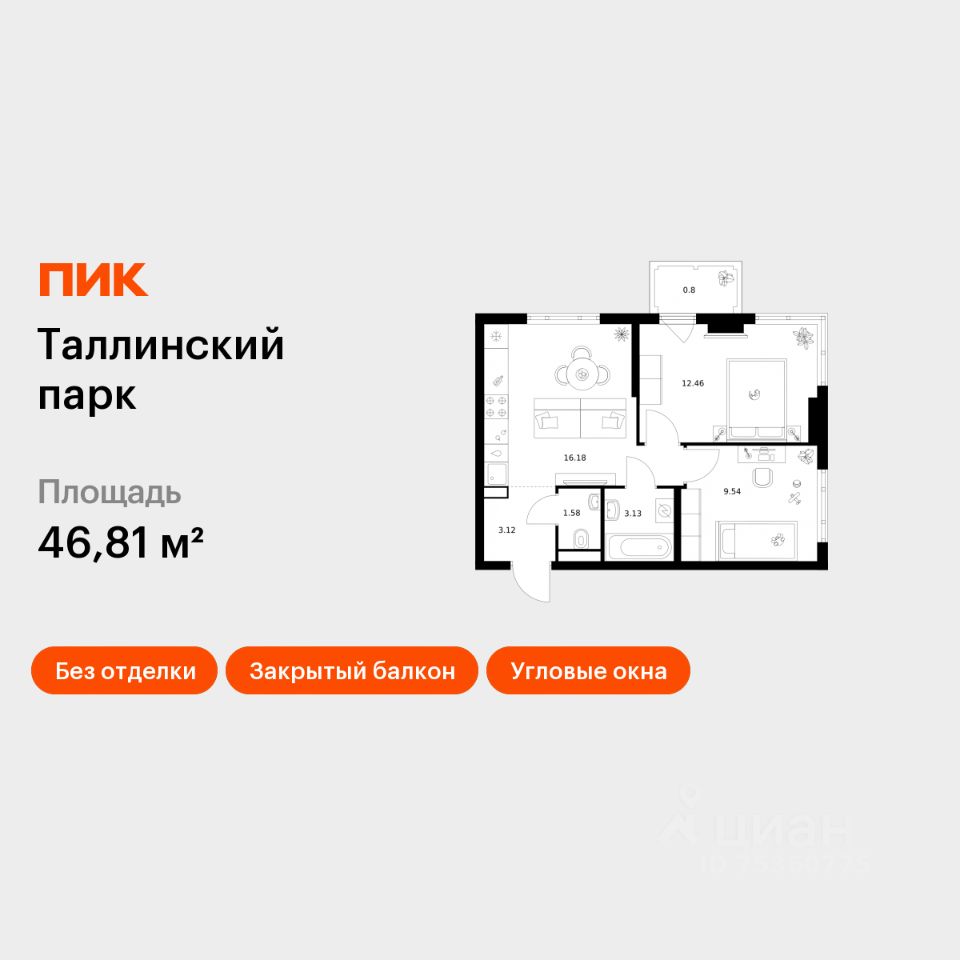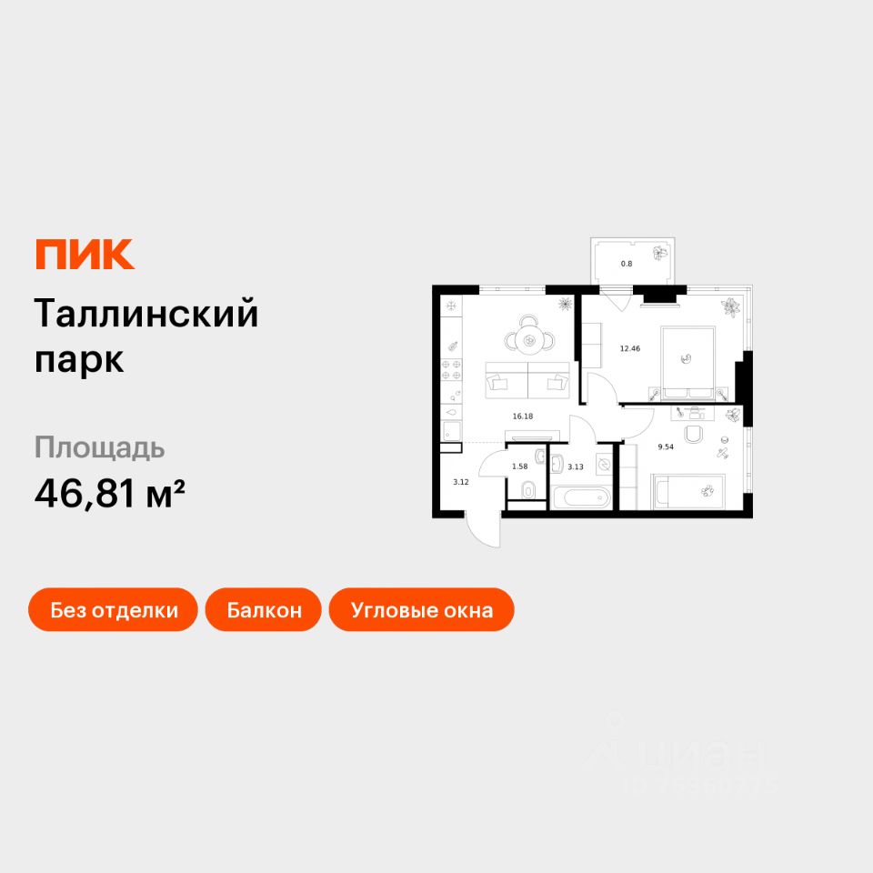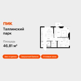 Продаётся 2-комн. квартира площадью 46,81 кв.м на 10 этаже 12 этажного дома (Корпус 4.2, Секция 1) проекта ПИК Таллинский парк. Светлый просторный подъезд на уровне земли, функциональная планировка, большие окна, без отделки.