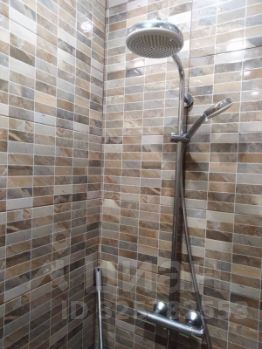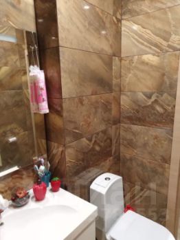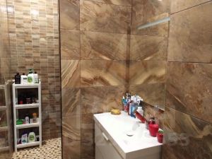 Просторный санузел отделан плиткой и оборудован сантехникой.