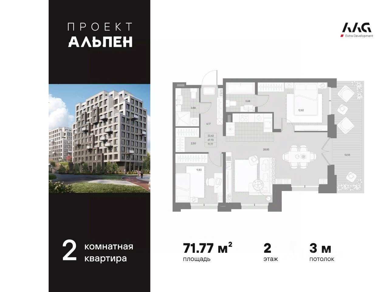 В центре Петербурга на берегу реки Охты представлена 2-х комнатная квартира на 2 этаже общей площадью 71.77 кв.м.