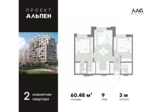 В центре Петербурга на берегу реки Охты представлена 2-х комнатная квартира на 9 этаже общей площадью 60.48 кв.м.
