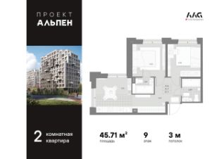 В центре Петербурга на берегу реки Охты представлена 2-х комнатная квартира на 9 этаже общей площадью 45.71 кв.м.