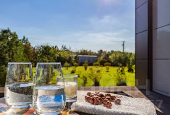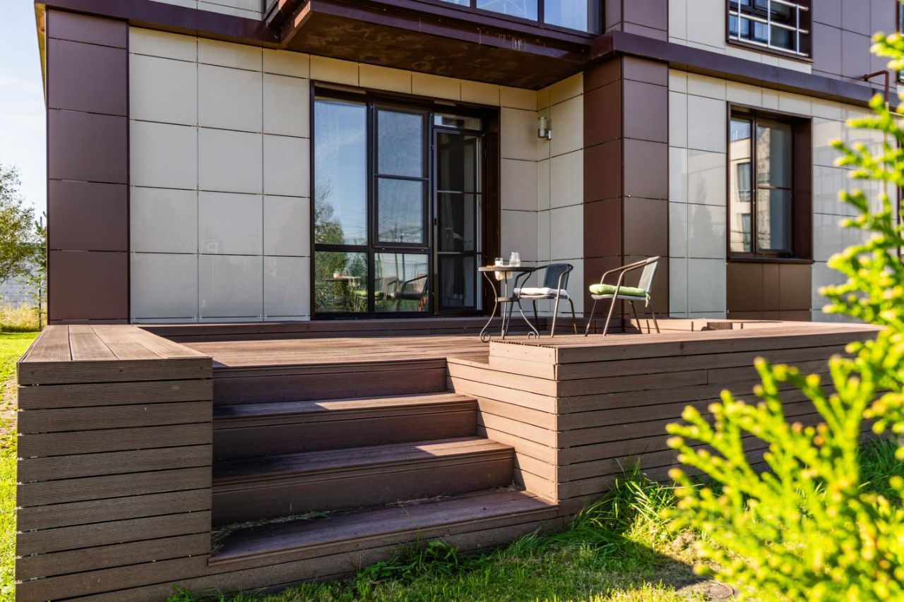 Из гостиной — выход на большую террасу, где можно отдыхать или завтракать на свежем воздухе.