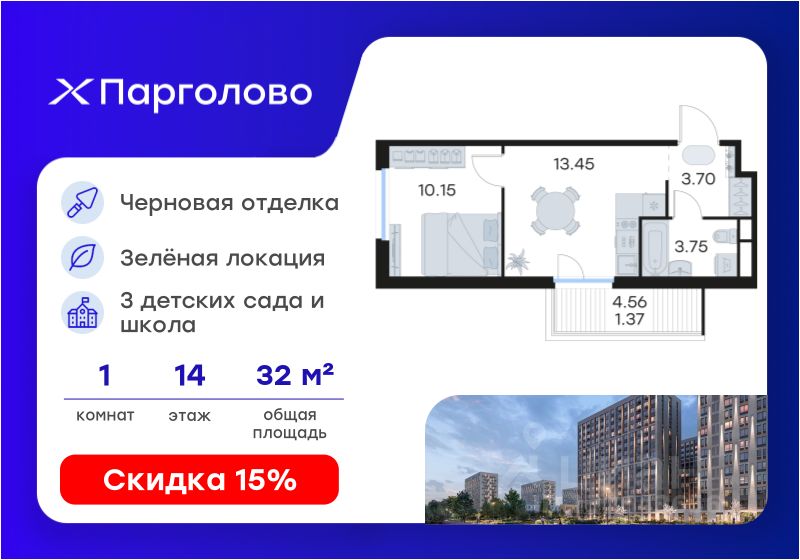 Продается 1-комн. квартира на 14-м этаже в проекте комфорт-класса Парголово. Общая площадь лота составляет 32,42 кв. м, из которых 10,15 кв. м отведено под жилую и 13,45 кв. м под кухонную зону. Номер квартиры - 263.
