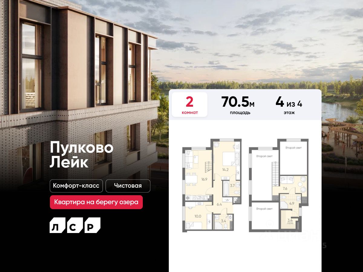 Продается 2-комнатная квартира в ЖК "Пулково Лейк" на 4 этаже. Общая площадь составляет 70.50 кв. м. Квартира с чистовой отделкой. Жилой комплекс "Пулково Лейк" располагается по адресу Санкт-Петербург, Московский.
