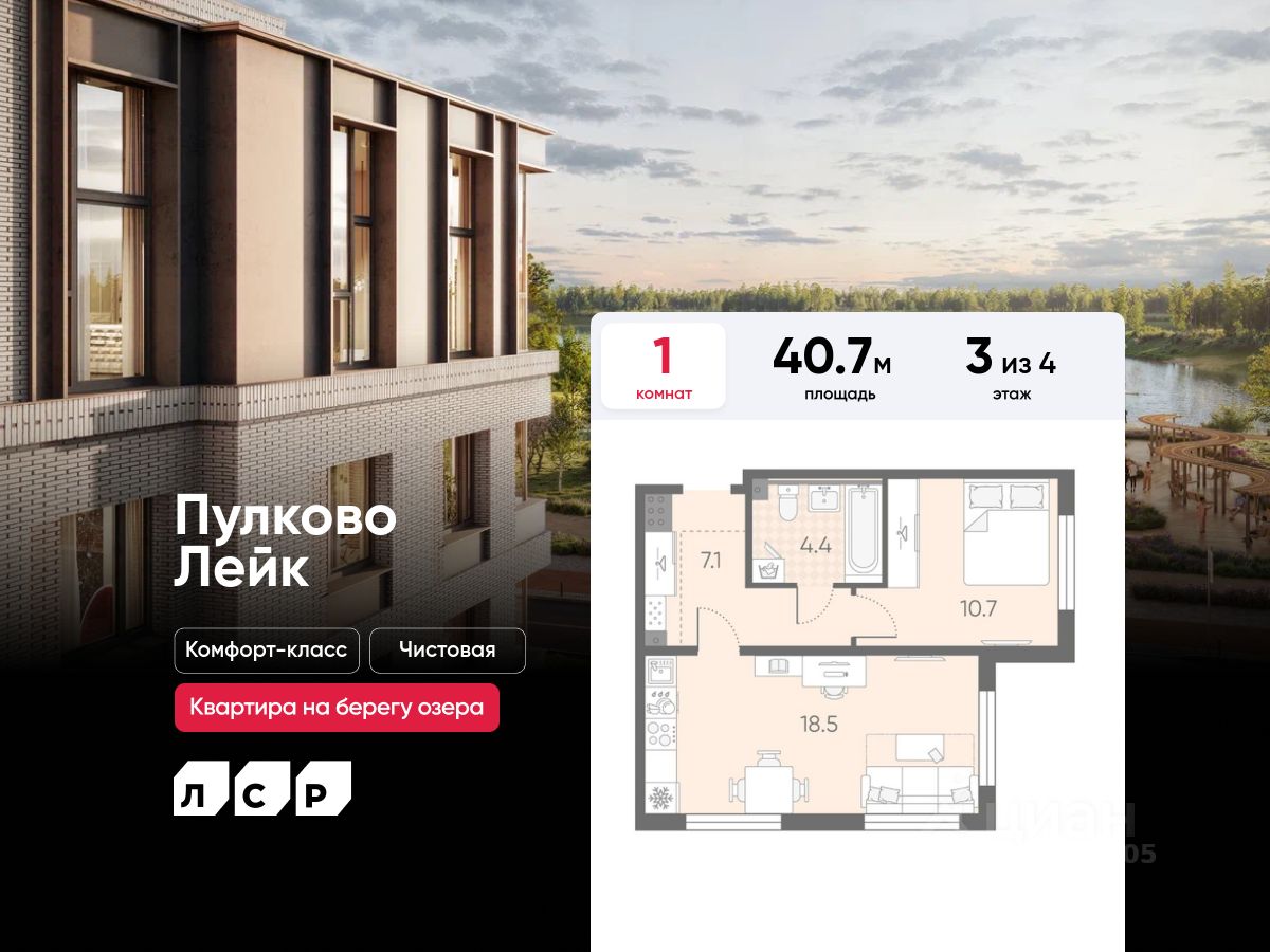 Продается 1-комнатная квартира в ЖК "Пулково Лейк" на 3 этаже. Общая площадь составляет 40.70 кв. м. Квартира с чистовой отделкой. Жилой комплекс "Пулково Лейк" располагается по адресу Санкт-Петербург, Московский.