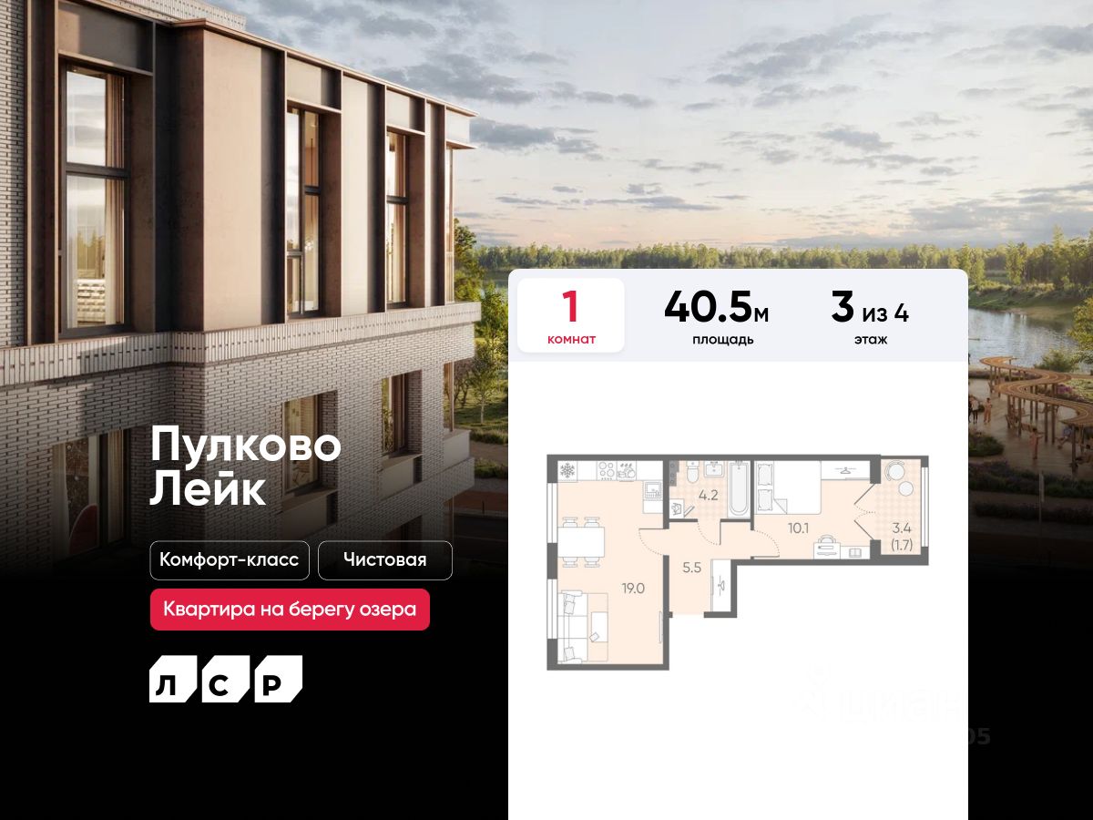 Продается 1-комнатная квартира в ЖК "Пулково Лейк" на 3 этаже. Общая площадь составляет 40.50 кв. м. Квартира с чистовой отделкой. Жилой комплекс "Пулково Лейк" располагается по адресу Санкт-Петербург, Московский.