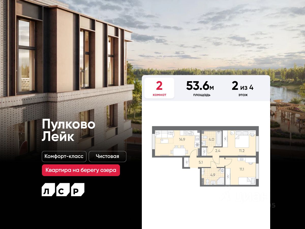 Продается 2-комнатная квартира в ЖК "Пулково Лейк" на 2 этаже. Общая площадь составляет 53.60 кв. м. Квартира с чистовой отделкой. Жилой комплекс "Пулково Лейк" располагается по адресу Санкт-Петербург, Московский.