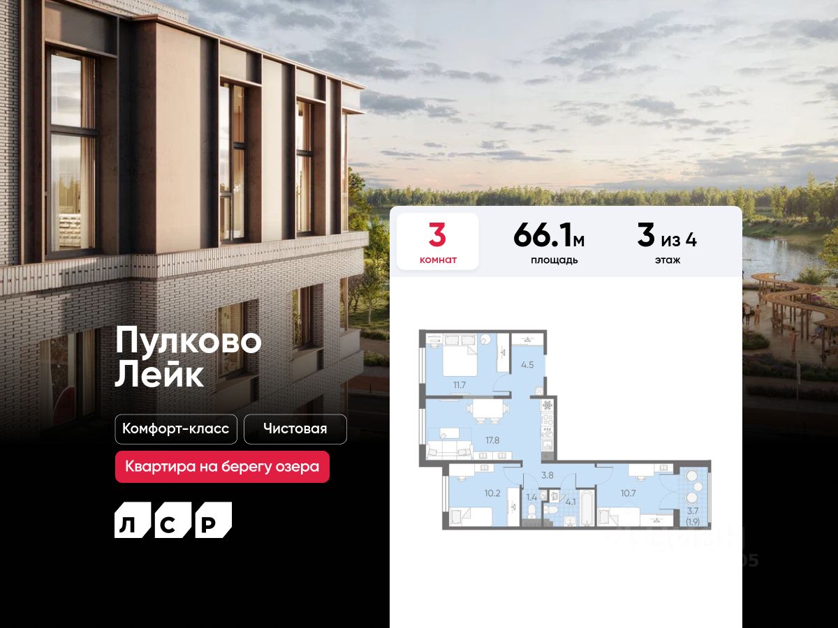 Продается 3-комнатная квартира в ЖК "Пулково Лейк" на 3 этаже. Общая площадь составляет 66.10 кв. м. Квартира с чистовой отделкой. Жилой комплекс "Пулково Лейк" располагается по адресу Санкт-Петербург, Московский.