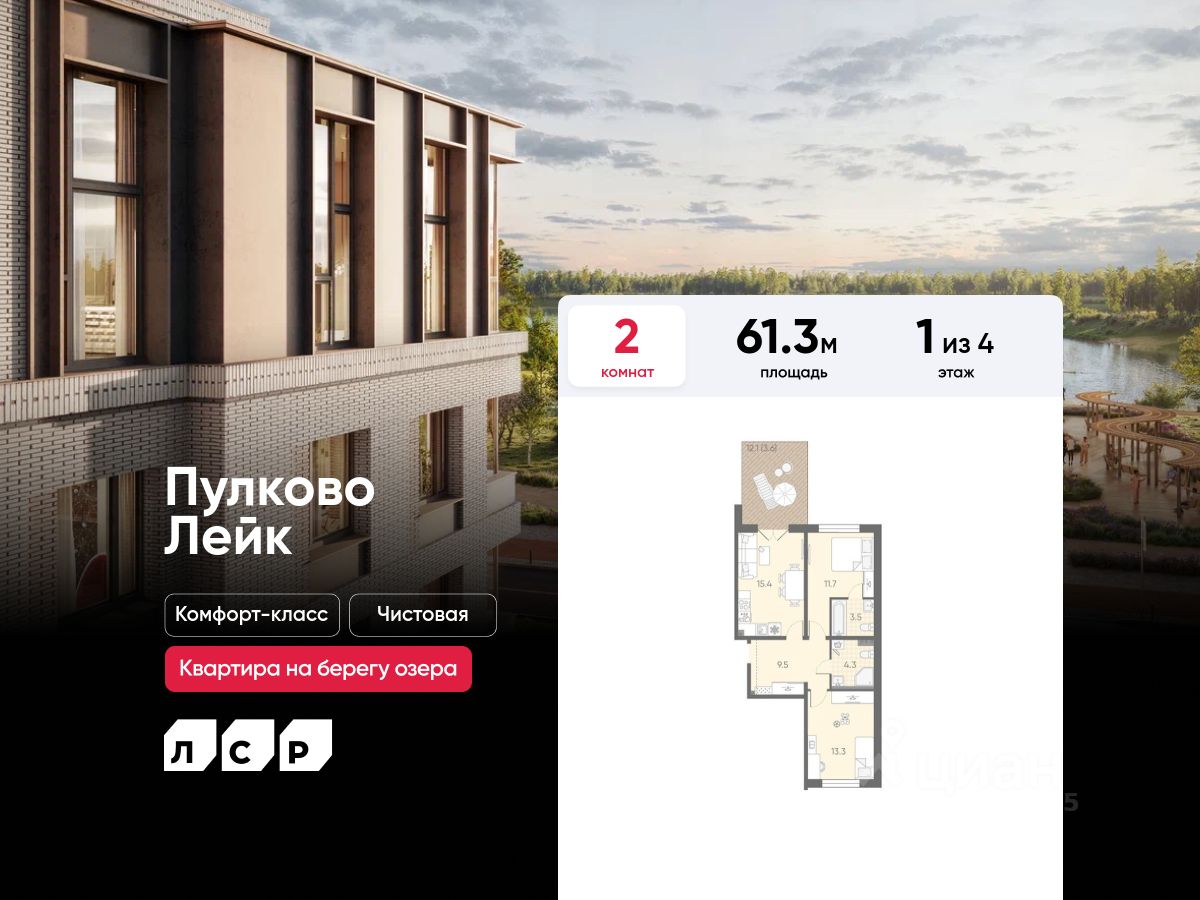 Продается 2-комнатная квартира в ЖК "Пулково Лейк" на 1 этаже. Общая площадь составляет 61.30 кв. м. Квартира с чистовой отделкой. Жилой комплекс "Пулково Лейк" располагается по адресу Санкт-Петербург, Московский.